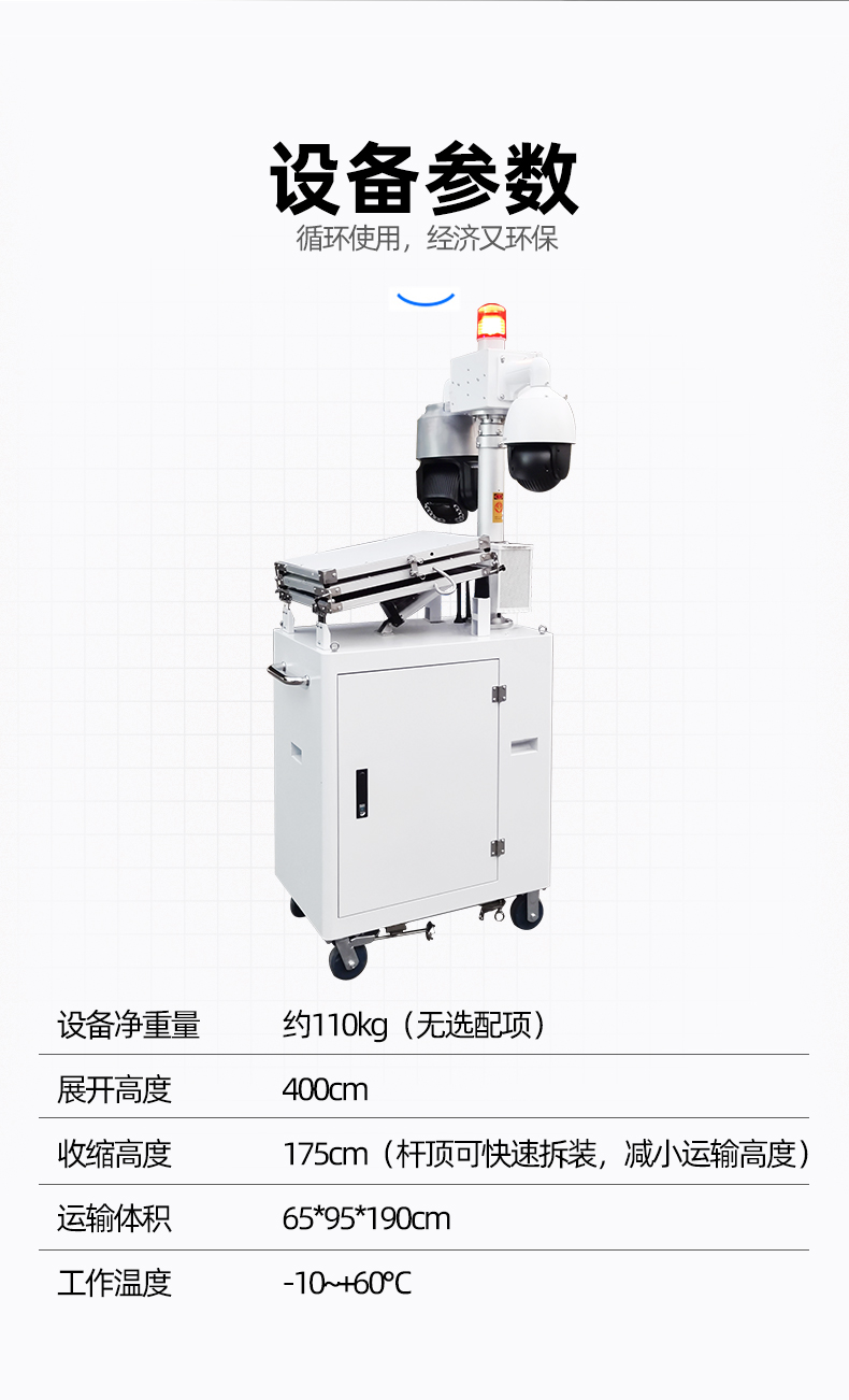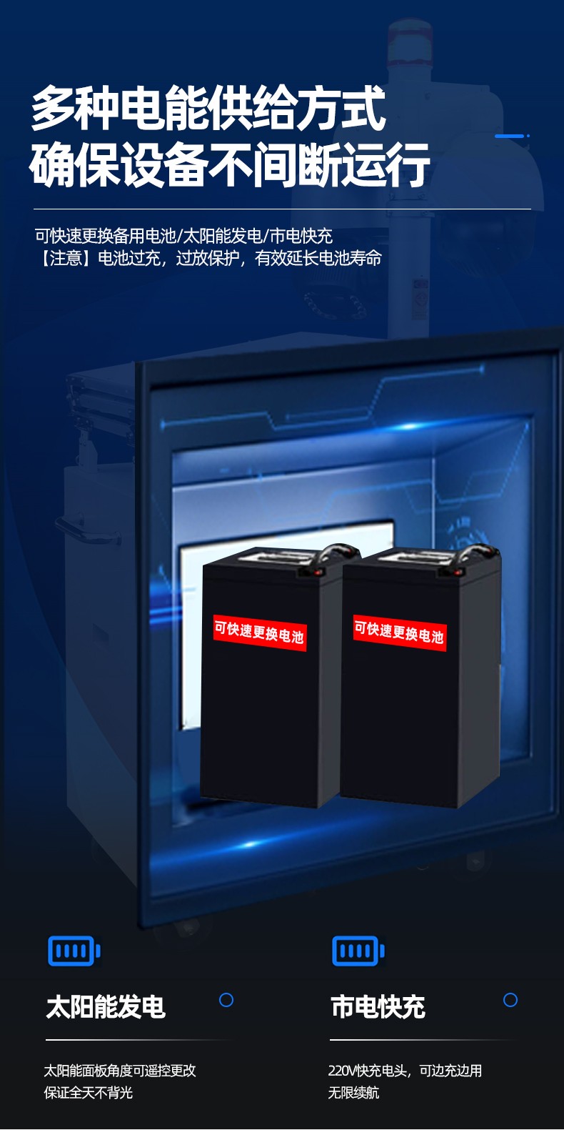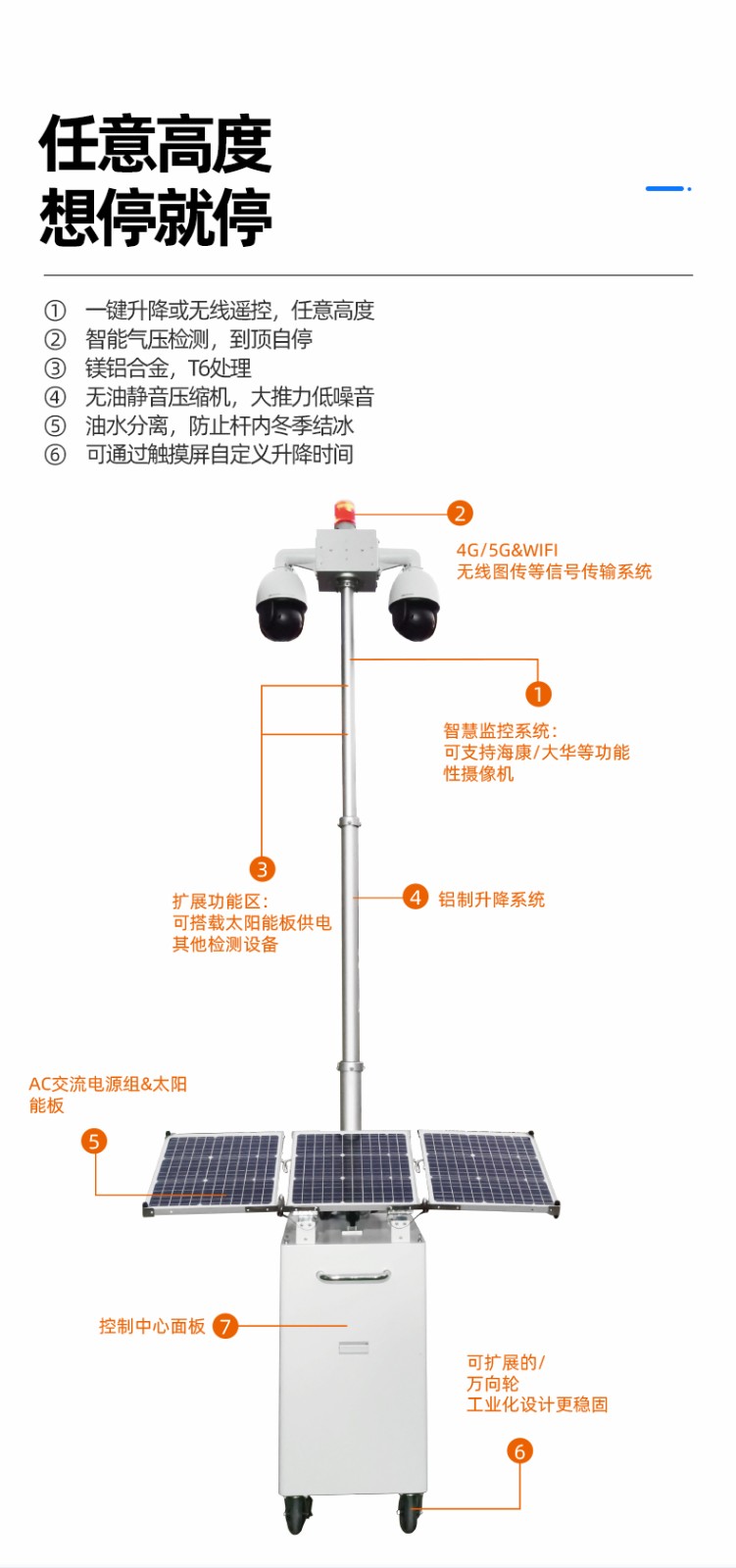 小哨兵移动监控系统太阳能电池供电超长续航便捷监控 betway88必威手机网页版多功能移动兵站(轻便型小哨兵移动监控)是一款十分灵活的中小型移动监控设备,自带网电,具备较高的机动性,系统可集高清视频监控、照明、报警、广播、对讲、气象环境监测、存储、控制、无线传输、一键升降等功能于一体,并可具备市电、太阳能等多种能源补给方式,提升续航时间,以适应各类复杂的环境。户外使用,不惧风雨,随需移动,循环利用。可广泛用于石油管道巡检、工地监控、电力维修监控、活动安防、户外作业等临时监控或长期监控。