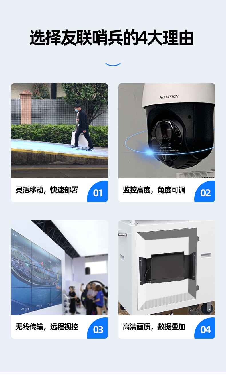 轻巧款小哨兵移动监控系统 betway88必威手机网页版新一代轻巧款迷你小哨兵移动监控系统,机型小巧可移动,灵活看护,免布线,随用随放的优点。主要用于视频监控、取证,采用“电池+电源”等多模式供电,无线网络传输,一键开机超便捷 ;整机投入使用,无需拆装,缩短工期;一次性费用投入,多场景反复使用,获得更大投入产出比;根据项目进度更改部署位置,使用更灵活;可加选AI功能,满足客户智能化识别需求,如支持人脸识别,车牌识别、安全帽检测、反光衣检测、抽烟检测、温湿度监控、扬尘监控等功能。